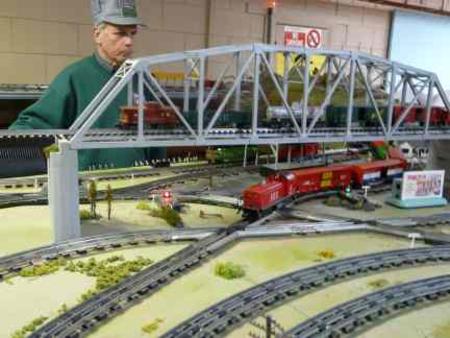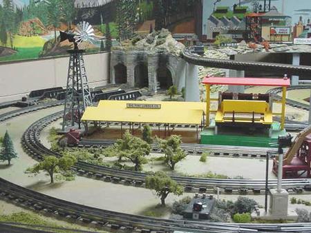 Our 10’ X 18’ O,S scale plus the 3’ x 15’ yard is always a highlight allowing as many as 5 trains zipping by at once. It includes some of Lionel’s operating accessories, which can be run by visitors from buttons beside the layout. The kit built 4’ through girder bridge and some interesting graffiti provide some of the highlights.
